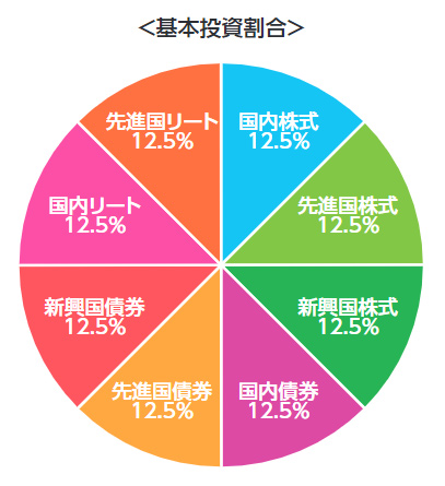 これはまぁ有名ですけど、株式、債券、リートを全て均等な投資割合で運用するインデックスです。とりあえずここに突っ込んでたら分散投資できてるわー。というもの。