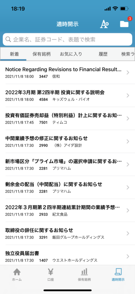 - 保有株やお気に入り株の適時開示を閲覧できる。これ便利