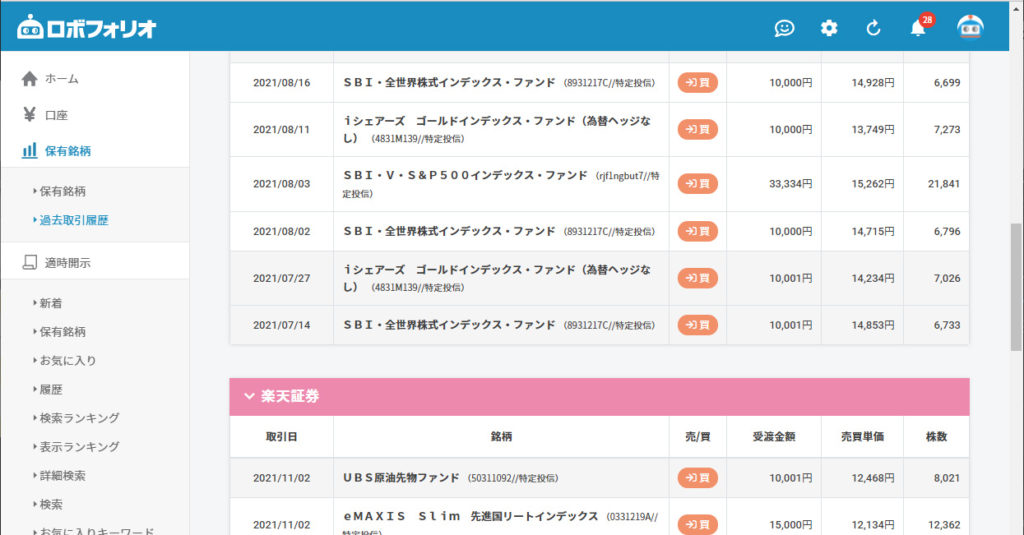 - 過去の保有銘柄の状況も一覧で表示可能
